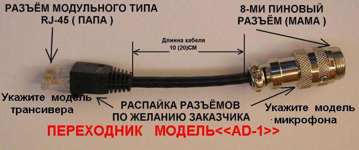 Предназначен для подключения электретного ручного микрофона ( в народе прозванный мыльница ) с 8-ми пиновым круглым разъёмом к трансиверам новых моделей имеющих входные микрофонные разъёмы модульного