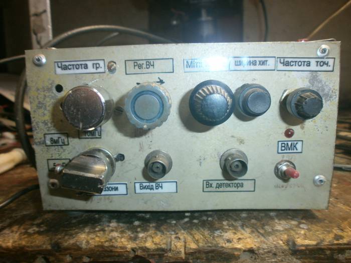 Приставка ГКЧ до осцилографа для налаштування кварцових фільтрів. Три диапазони: 1- 4-6 мГц, 2-7-9 мГц, 3 - 10-12 мГц. Ширина качання 4-10 мГц. Експлуатувався з осцилографом С1-55. Вихід на частотомір, можливе підключення стороньої мітки, регулювання ширини мітки.В комплекті з детекторним шнуром.