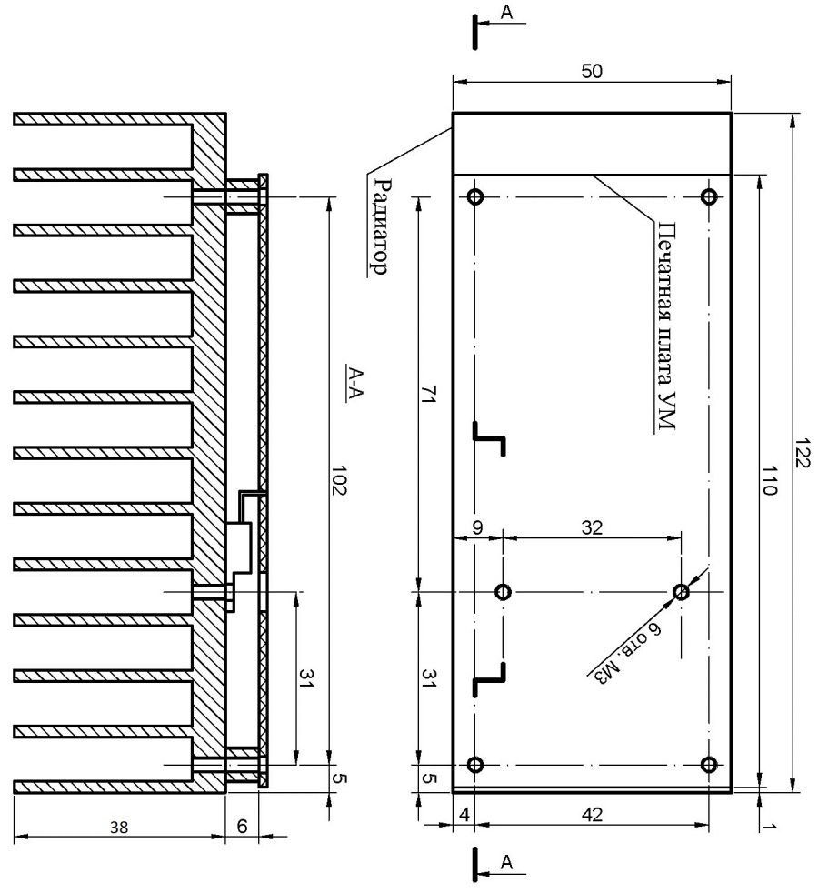 Транзисторы RD16HHF1 крепятся к радиатору непосредственно, а IRF510 через изолирующие силиконовую прокладку и втулку. Для исключения перегрева выходных транзисторов при длительно работе на передачу эффективная площадь рассеяния радиатора (или металлического шасси/корпуса) должна быть не менее 250 кв.см для RD16HHF1 и не менее 400 кв.см. для IRF510. Подключение платы УМа должно производиться максимально короткими проводами