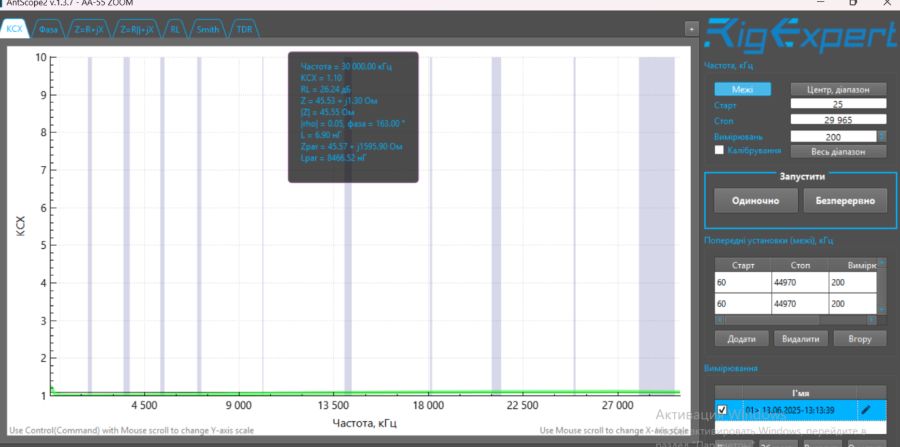 КСВ составляет от 1,01 до 1,1 в диапазоне от 1 до 30 МГц.