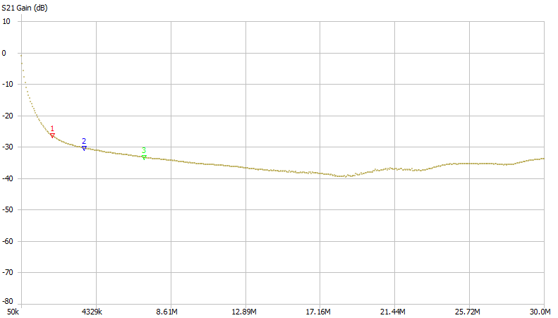 Этот BalUn имеет большое затухание синфазного тока более 30 дБ в диапазоне частот от 3 до 30 МГц и минимальные потери дифференциального тока.