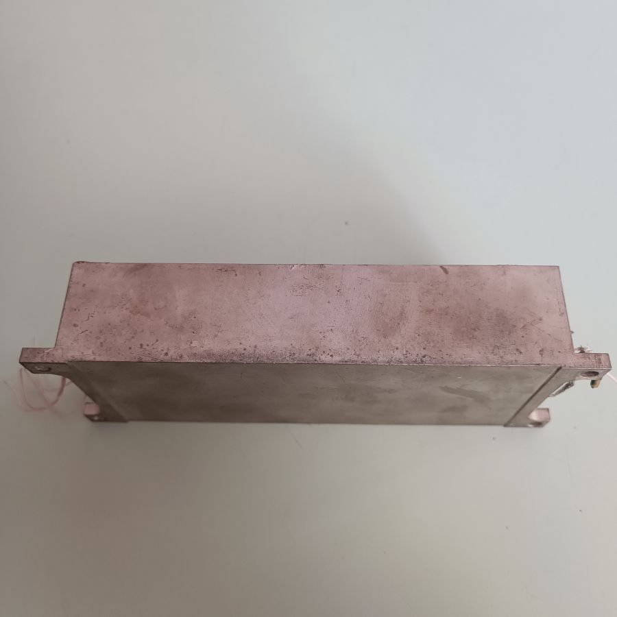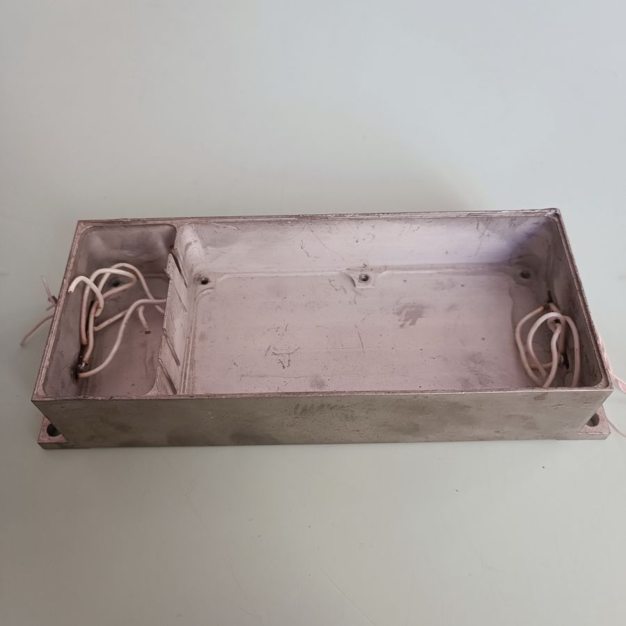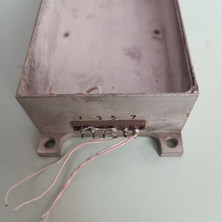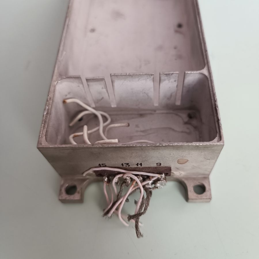 3. Размер 157(162 с ушами)х65х35мм, четыре посадочные отверстия D5мм, 167х55мм, два отсека, в каждом впаяны проходные изоляторы-слезки по 6 шт., под ними снаружи впаяны земляные шпильки. Покрытие ОВИ (олово-висмут).