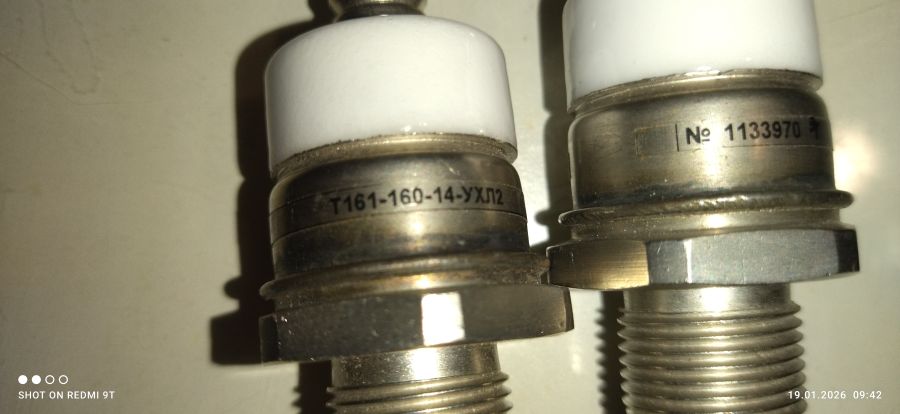 Силовые тиристоры Т161-160-14. Эти тиристоры представляют собой универсальные устройства в штыревой конструкции, способные эффективно преобразовывать и регулировать как постоянный, так и переменный ток до 160 ампер с частотой до 500 Гц . Новые.1шт- 250гр.