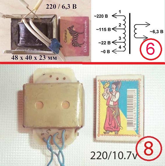 6 220/6.3 В Отводы 115 В 22 В Габариты по железу 48 х 40 х 23 мм