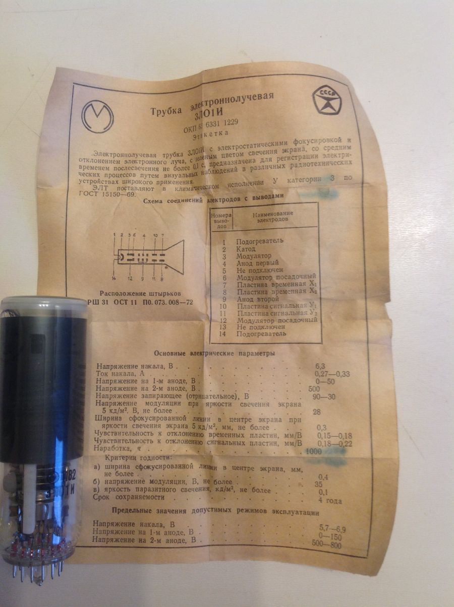 Осциллографическиая ЭЛТ с электростатическим отклонением луча и зеленым цветом свечения. 3ЛО1И - крошечная круглая трубка, диаметр экрана всего 30 мм. Использовалась в легендарных радиолюбительских осциллографах серии «ОЛ» и «Н313».