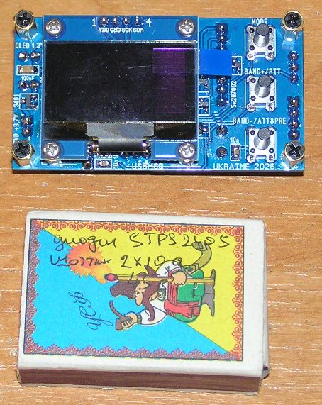 Форма выходных сигналов гетеродинов - меандр величиной примерно 2,5 В (Up-p). Потребляемый ток с механическим энкодером и средним уровнем яркости дисплея не превышает 60 мА. Рекомендуемое напряжение питания синтезатора +3,7 …+ 5 В. ВНИМАНИЕ: напряжение питания синтезатора не должно превышать +7 В!!! Габаритные размеры синтезатора (без учёта ответных частей разъёмов) 67(Ш)х35(В)х20(Г) мм. Подключение САТ реализовано через USB интерфейс посредством внешнего адаптера-переходника на основе CH340/341.